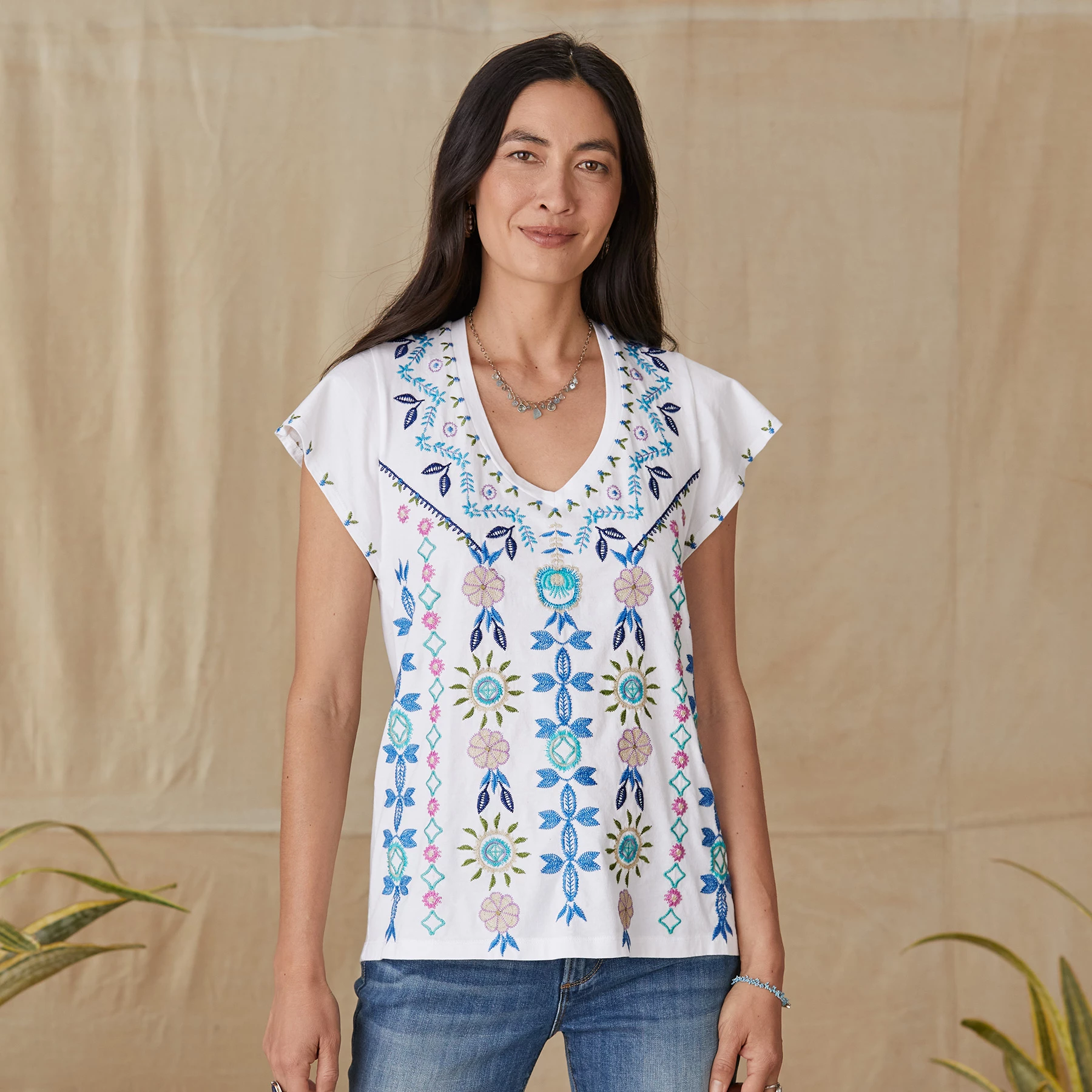 Easy tee featuring flutter sleeves with trim detail. Beautiful allover embroidery. Cotton. Machine wash. Imported. Sizes XS (0 to 2), S (4 to 6), M (8 to 10), L (12 to 14), XL (16 to 18), XXL (20 to 22). Approx. 26-1/2″L.