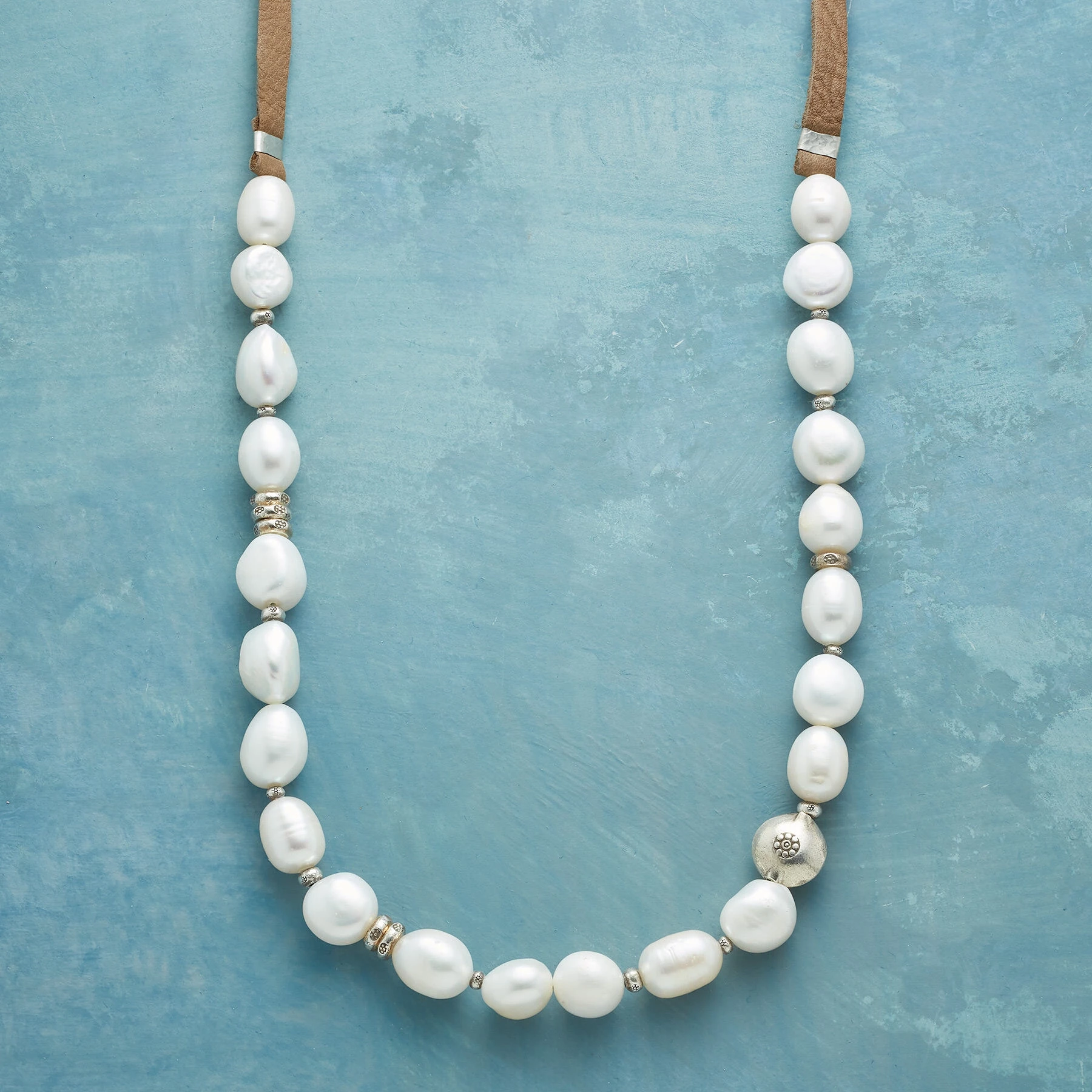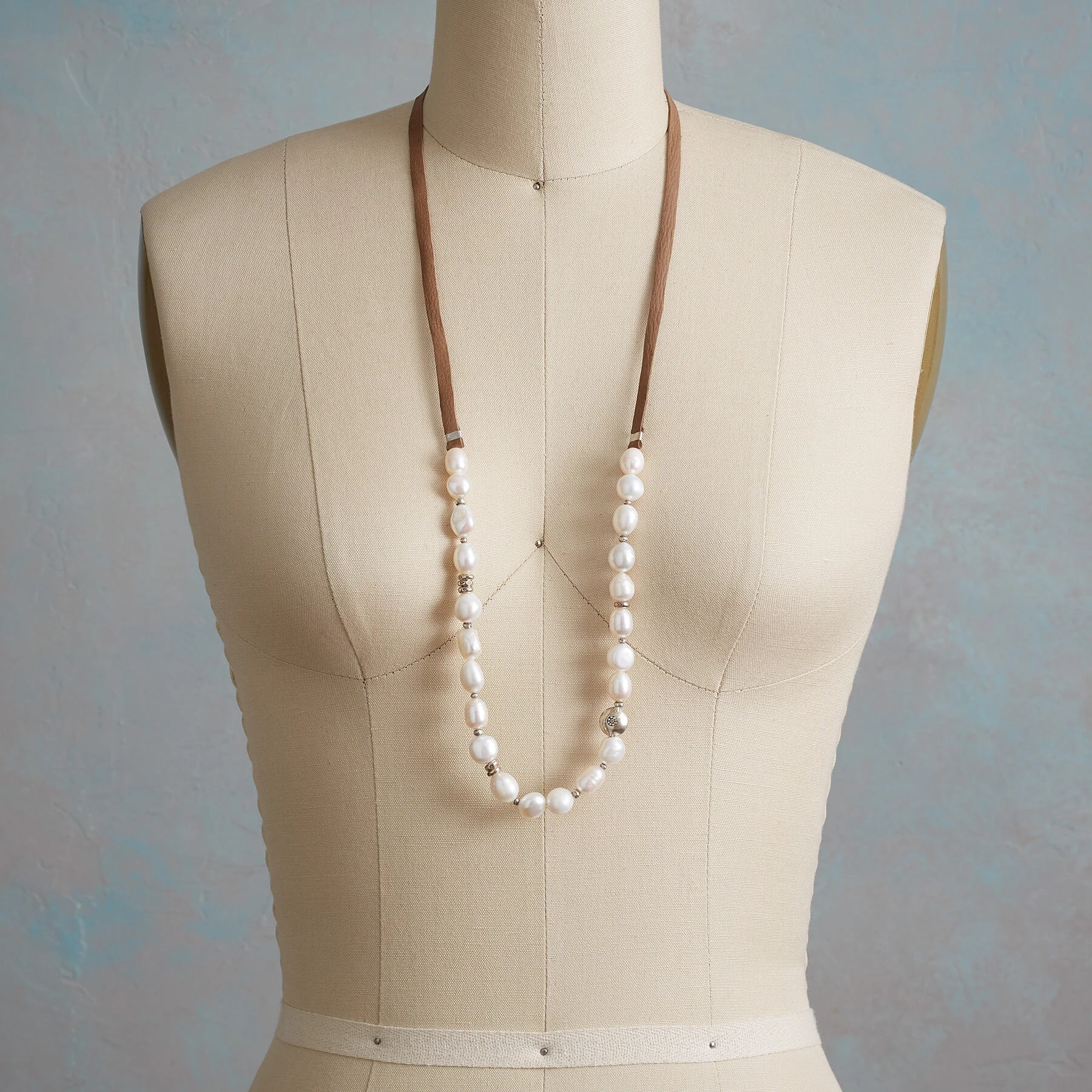 Etched sterling silver beads float among luminous white cultured freshwater pearls, each beautifully unique. They’re tethered by leather laces that adjust with a sterling slider. Handcrafted. Exclusive. Approx. 31″L.