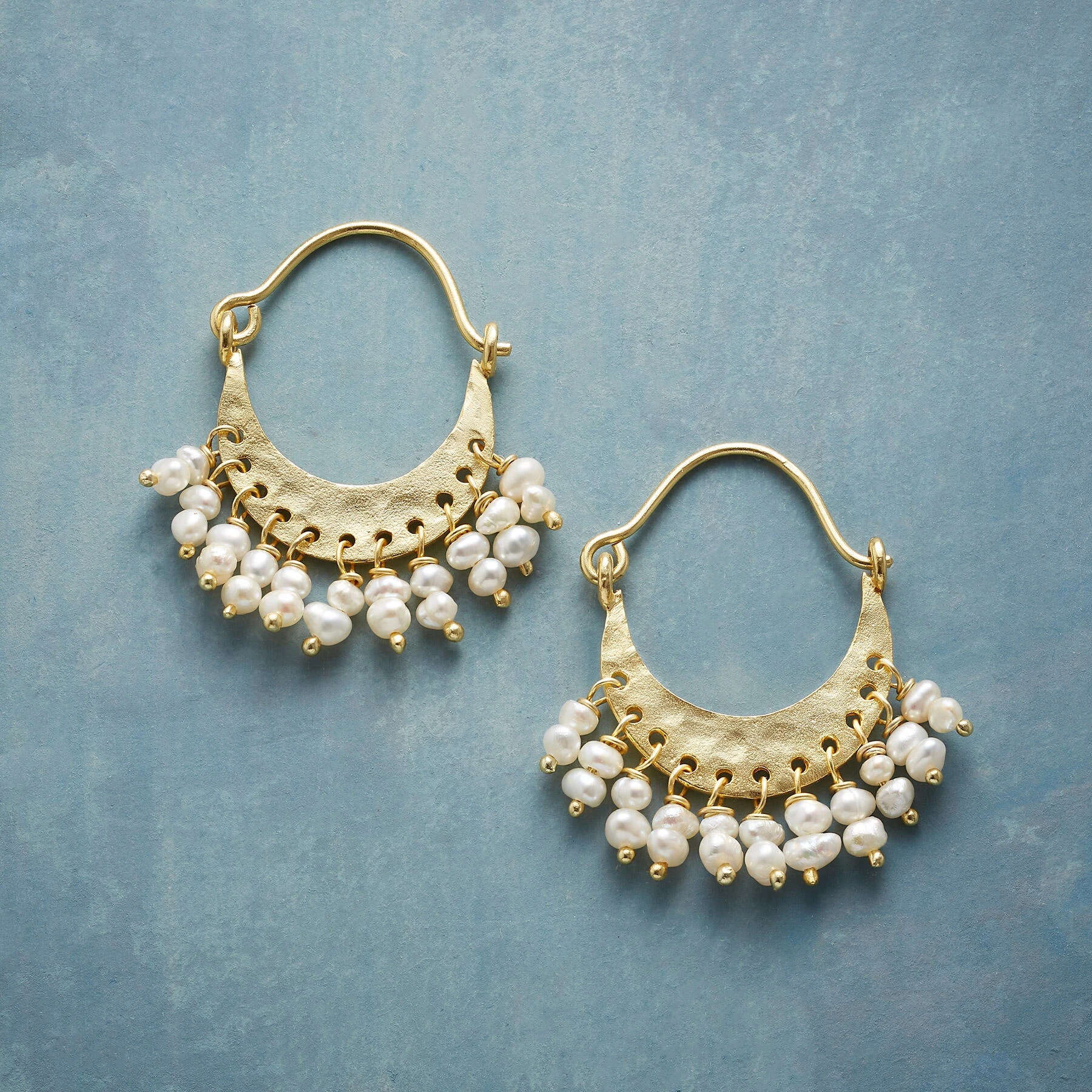 Hammer marks bounce light off crescent hoops, accentuated by a cultured freshwater pearl ruffle. Handcrafted in 22kt gold-plated sterling silver. Hinged wires. 1-1/4″L.