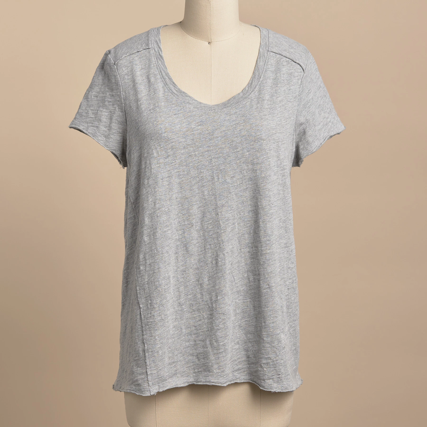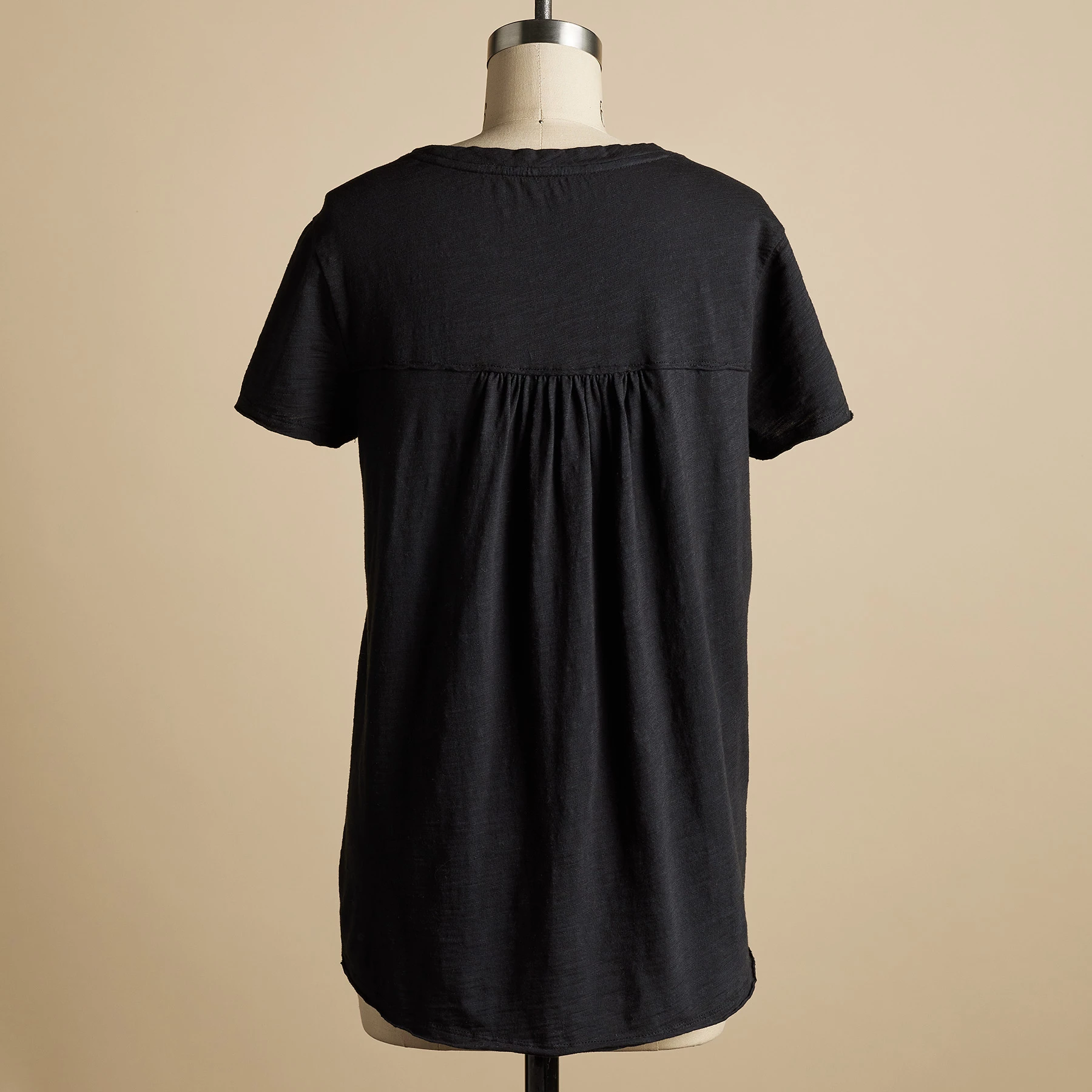 Soft, scoop neck tee with raw-edge seaming, shirring and hi-lo, crescent-shaped hemline. Cotton. Machine wash. Imported. Exclusive. Sizes XS (0–2), S (4–6), M (8–10), L (12–14), XL (16–18), XXL (20–22). Approx. 25″l.