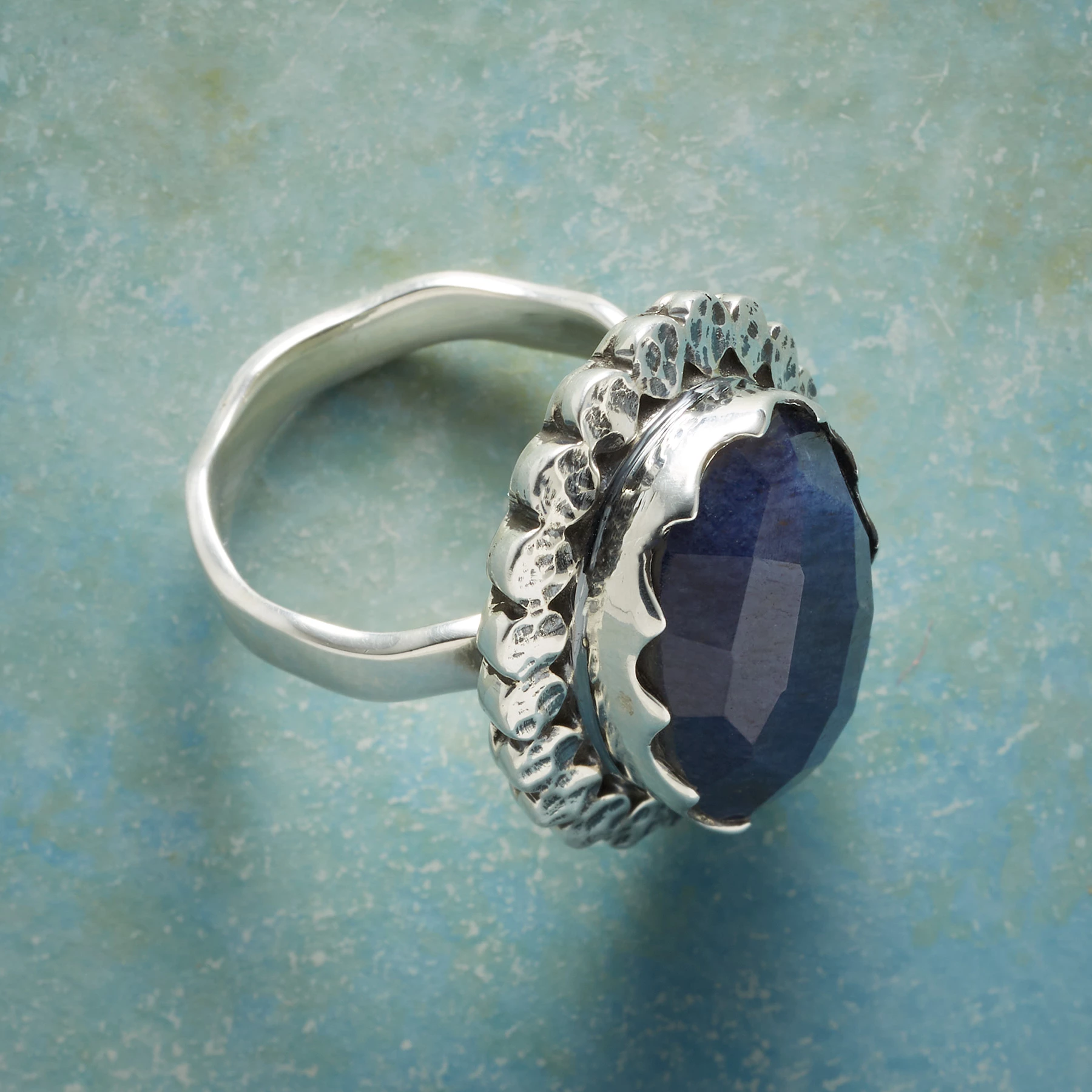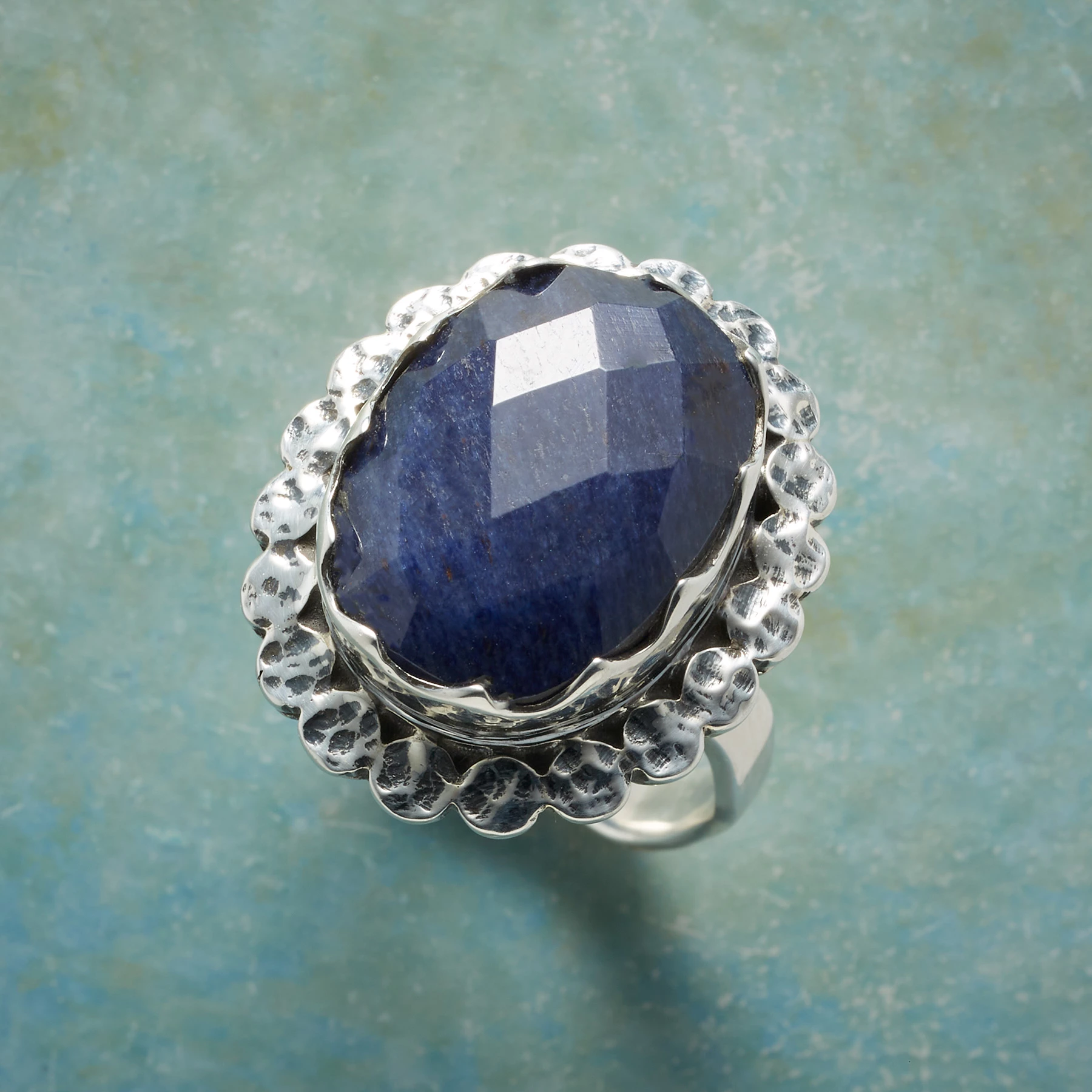 Our sizable expanse of faceted blue jade captivates within a pinched bead border on an irregularly hammered band. Oxidized sterling silver. Exclusive. Whole sizes 5 to 9.