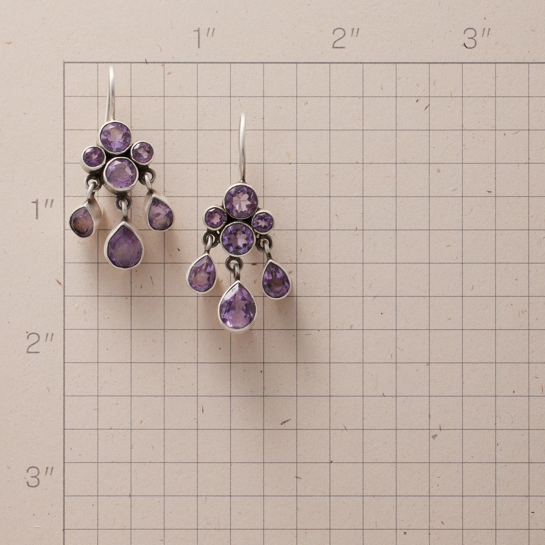 Faceted drops rain from a clutch of circular stones, all window set in matte sterling silver to make the most of amethyst’s regal hue. Designed by Jane Diaz, these dazzlers dangle from self-locking sterling wires. Handmade. 1-1/2″l.