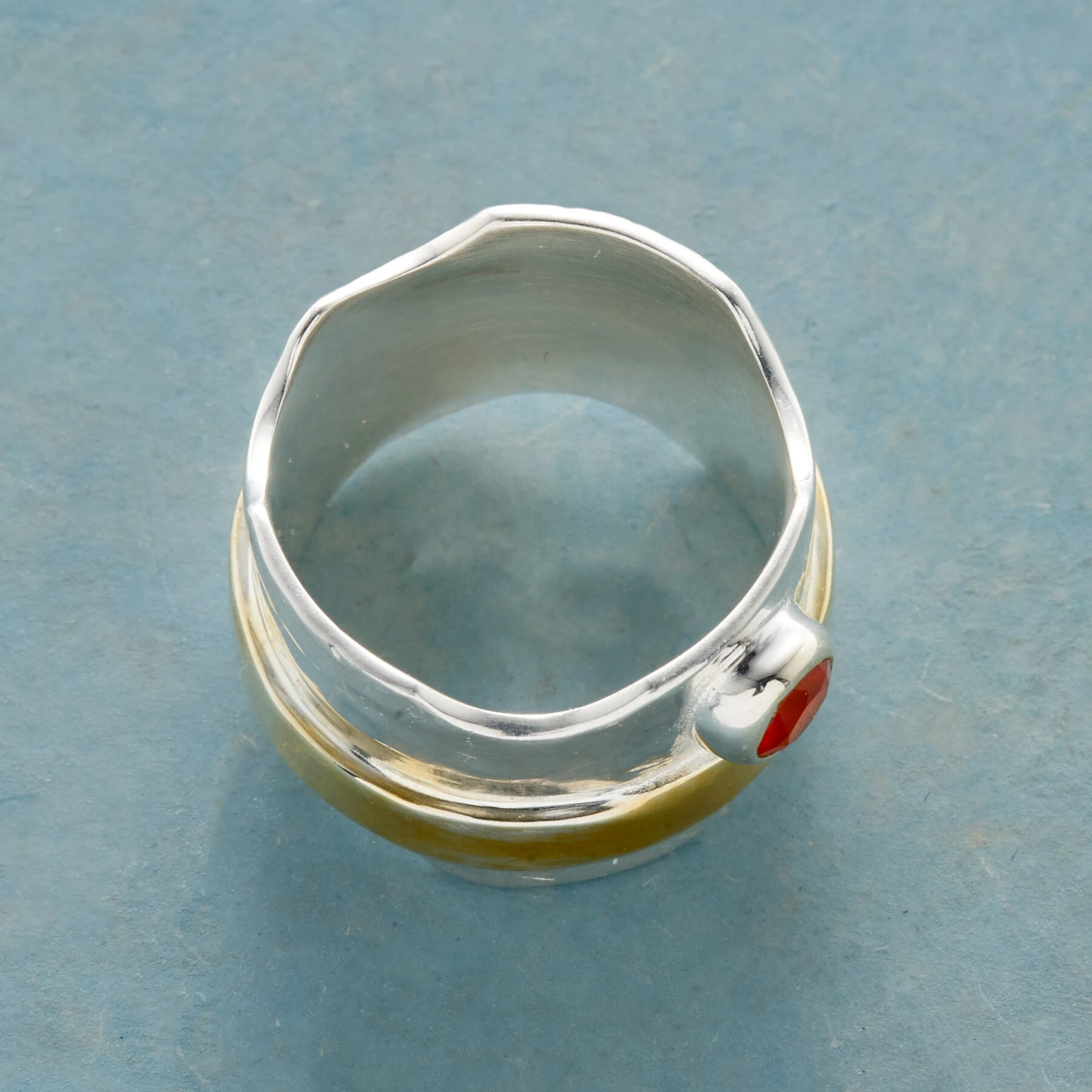 Fiery carnelian rises over the horizon on a sterling silver band hand cut with hills and valleys. 14kt gold plate bezel and horizon line. Exclusive. Whole sizes 5-10. Approx. 1/2″w.