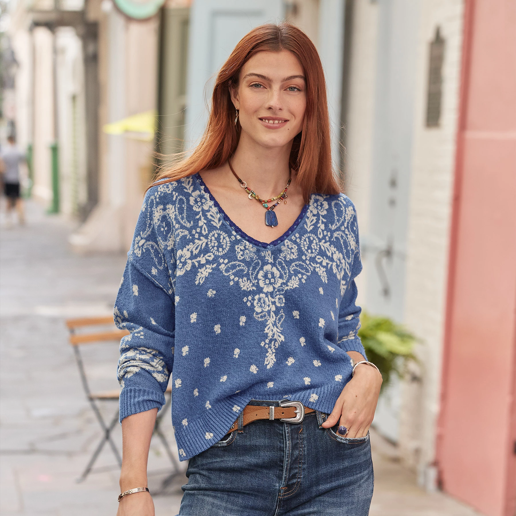 So easy and soft, our V-neck sweater is bandana printed with hand stitch details at the neckline. Rib trim. Acrylic/cotton/polyester/nylon. Machine wash. Imported. Exclusive. Sizes XS (0–2), S (4–6), M (8–10), L (12–14), XL (16–18), XXL (20–22). Approx. 22-1/2″L.