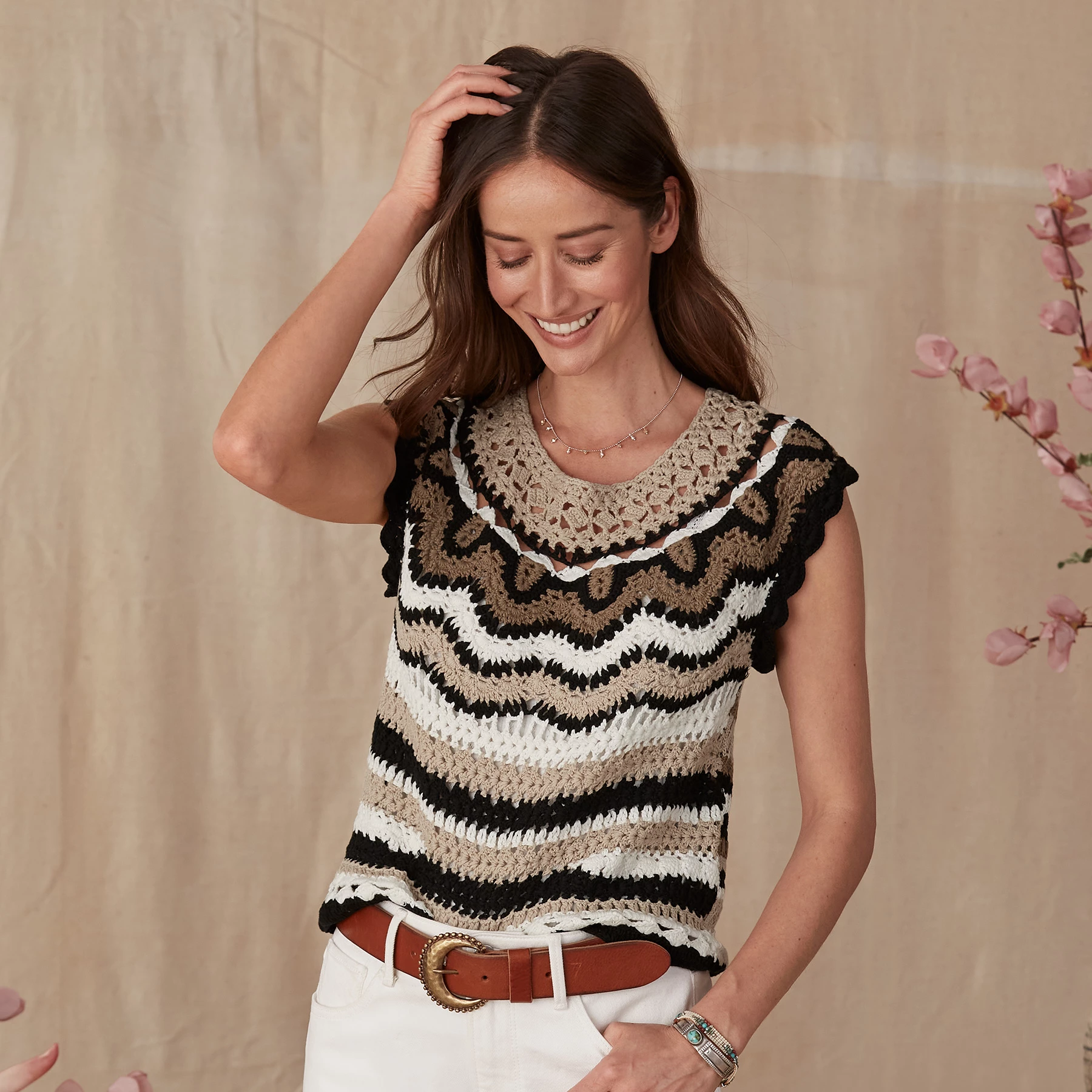This hand-crocheted sweater features varying stripes reminiscent of a bold chevron pattern. Cotton. Hand wash. Imported. Sizes XS (0 to 2), S (4 to 6), M (8 to 10), L (12 to 14), XL (16 to 18), XXL (20 to 22). 21″L.