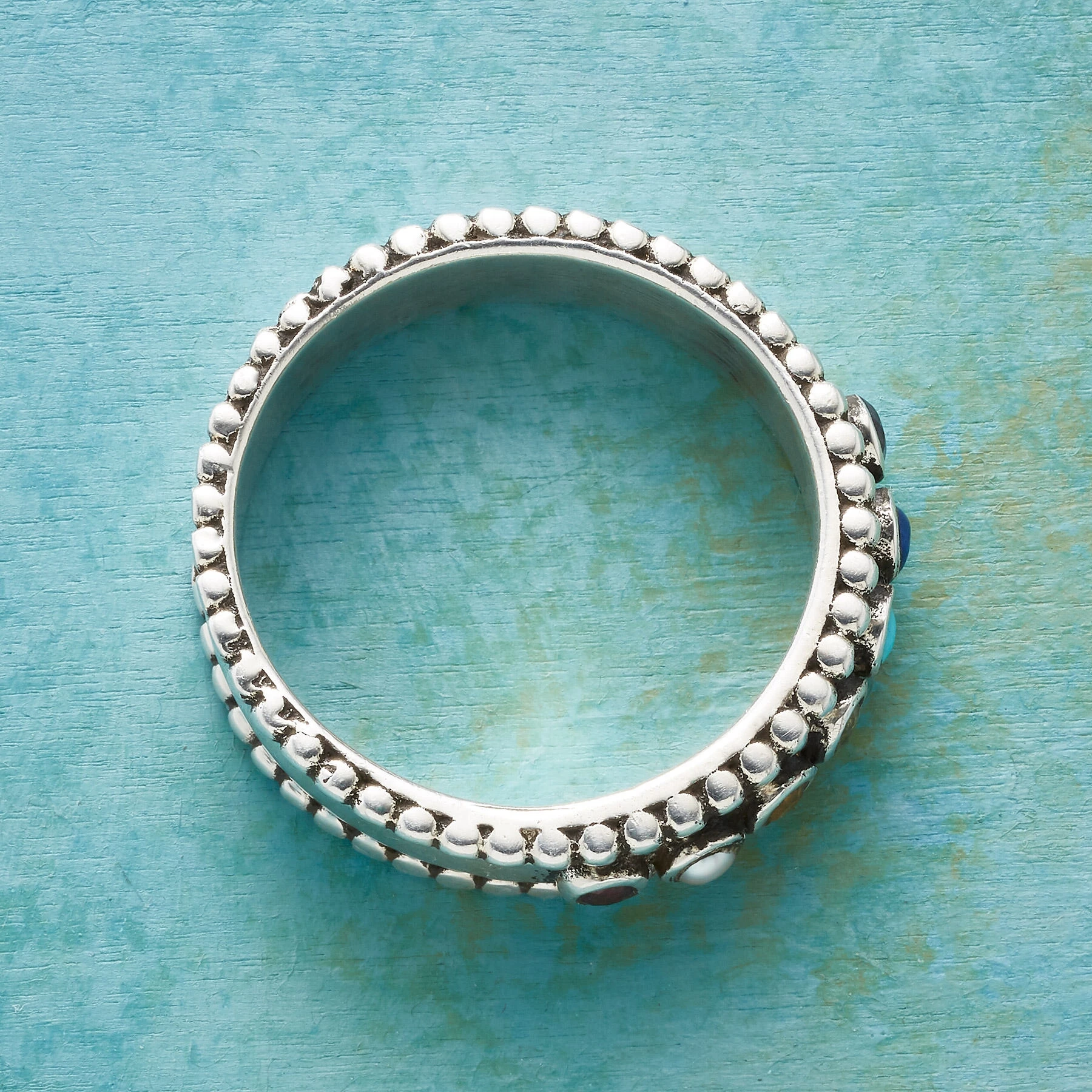 Seven gems nestle within the borders of our sterling silver band: amethyst, citrine, garnet, lapis, peridot, turquoise and cultured freshwater pearl. Handcrafted. Whole sizes 5 to 10.
