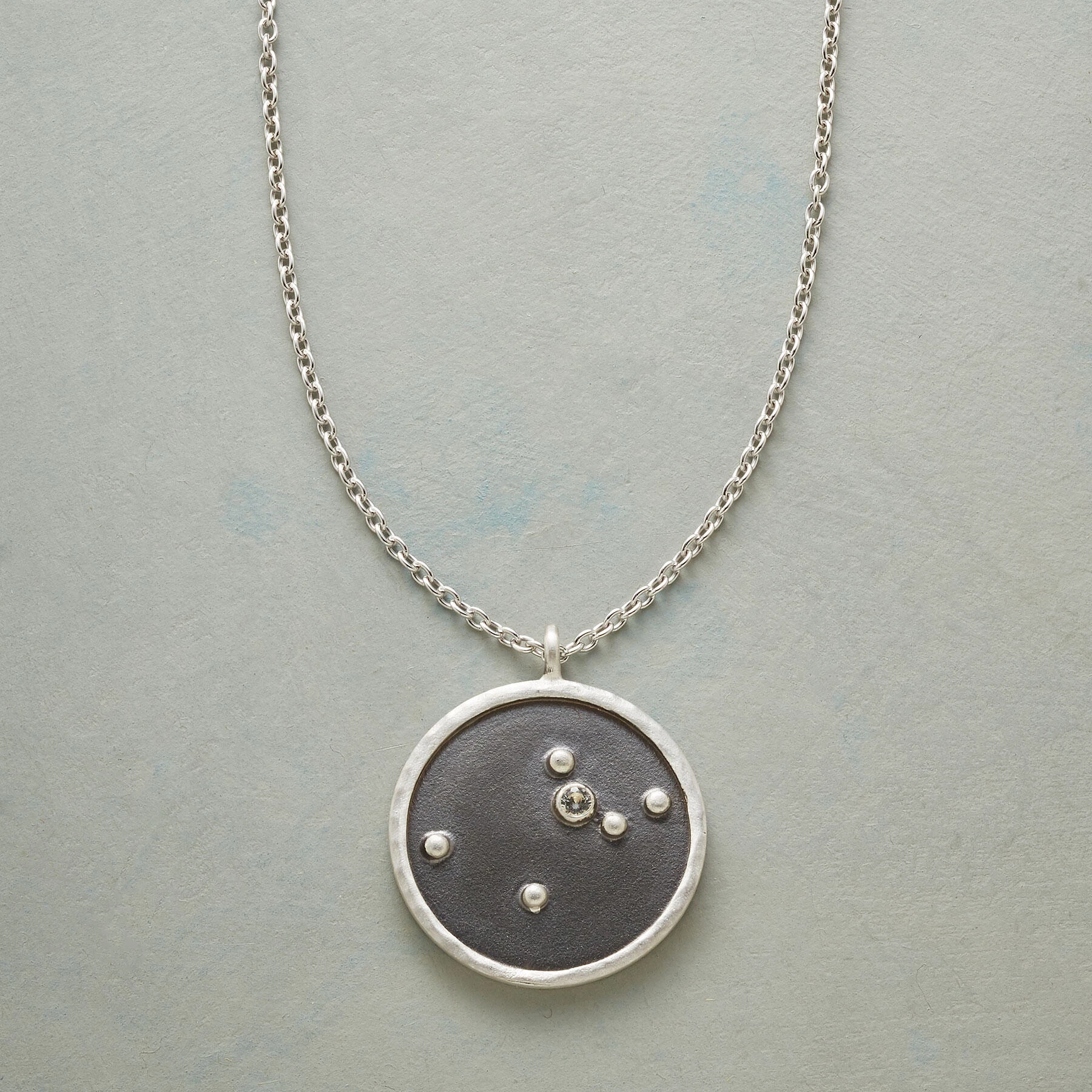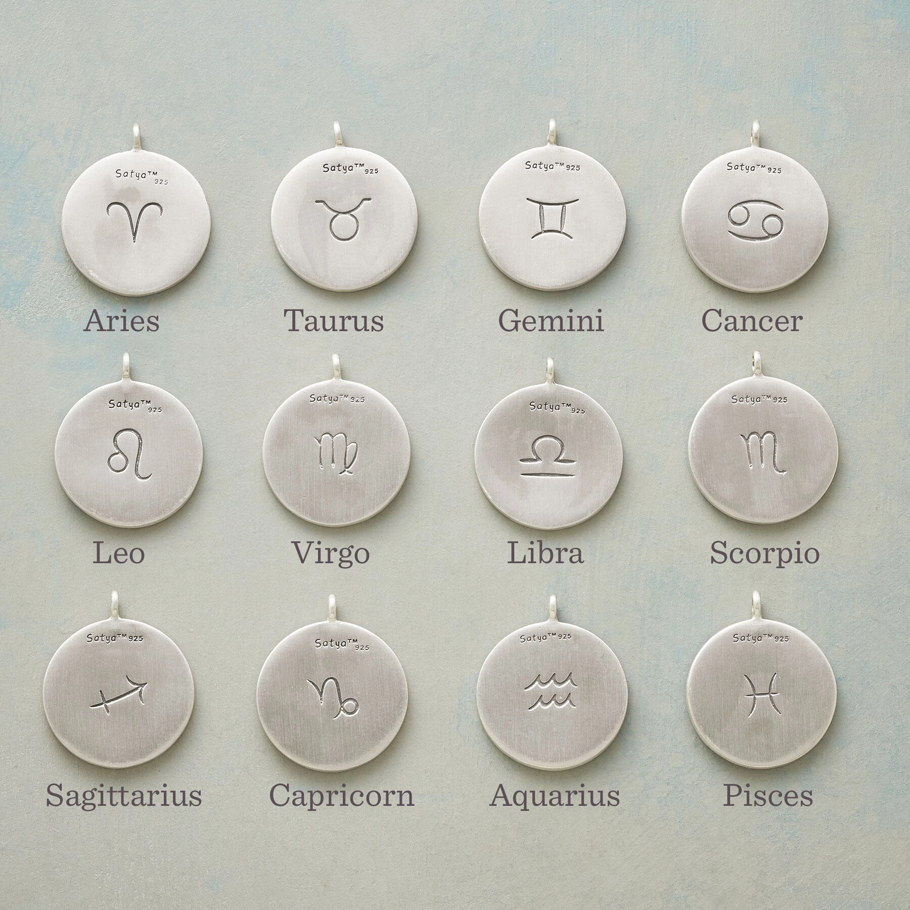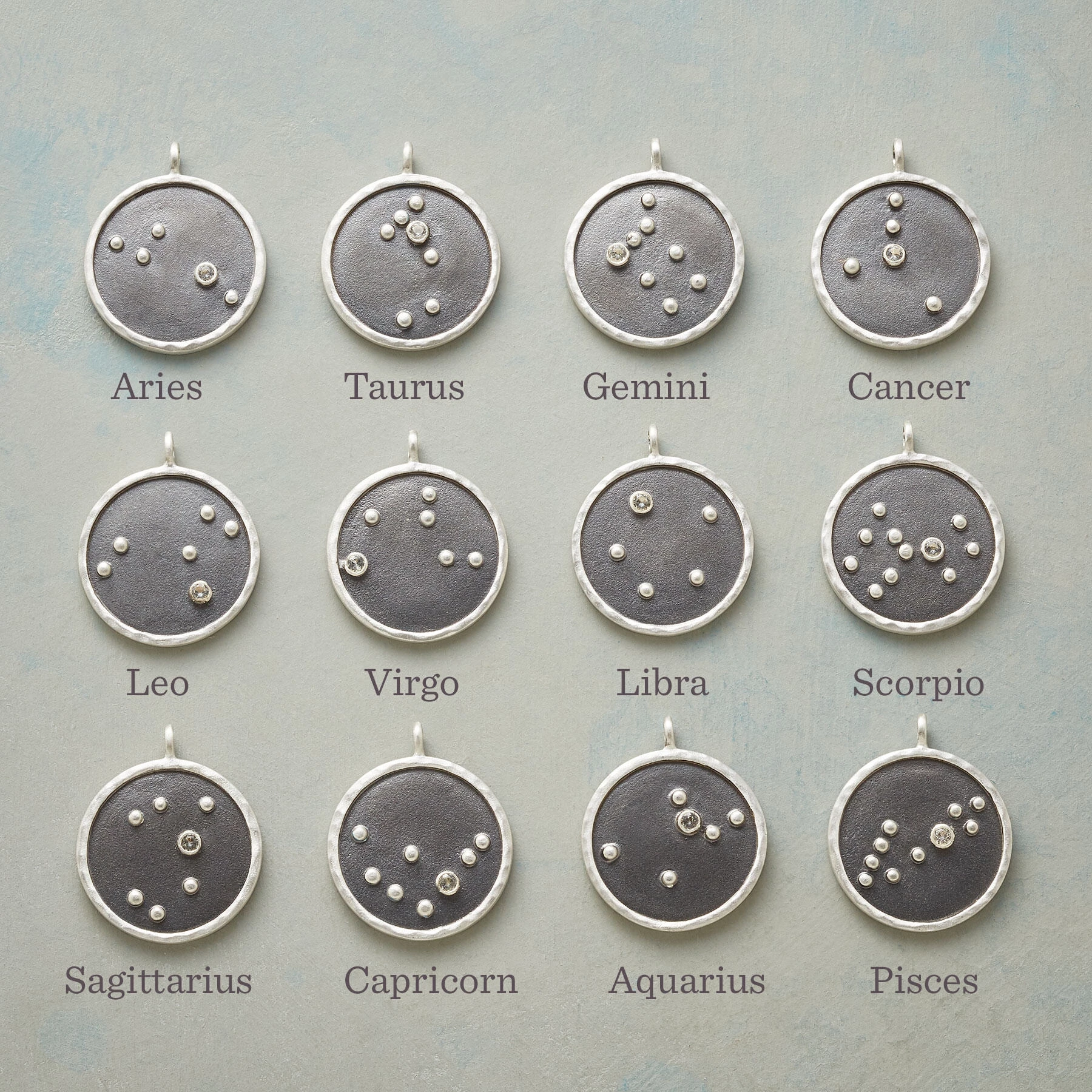 Hand cast in matte sterling silver, with a gunmetal face showing each zodiac sign’s constellation in faceted white topaz, the sign stamped on the back. Necklace with sterling silver chain; spring ring clasp. 18″L; 7/8″ dia.