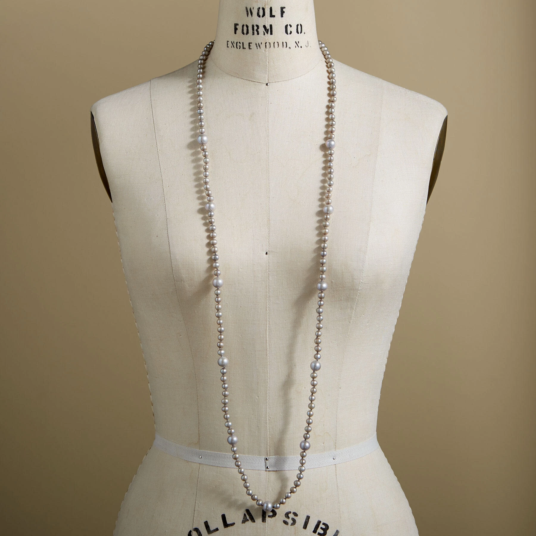 Chan Luu distinguishes her long pearl necklace—a rope of gray cultured pearls—with larger pearls spaced along its length, which can be doubled. Handcrafted with a sterling silver lobster clasp. 43″L.