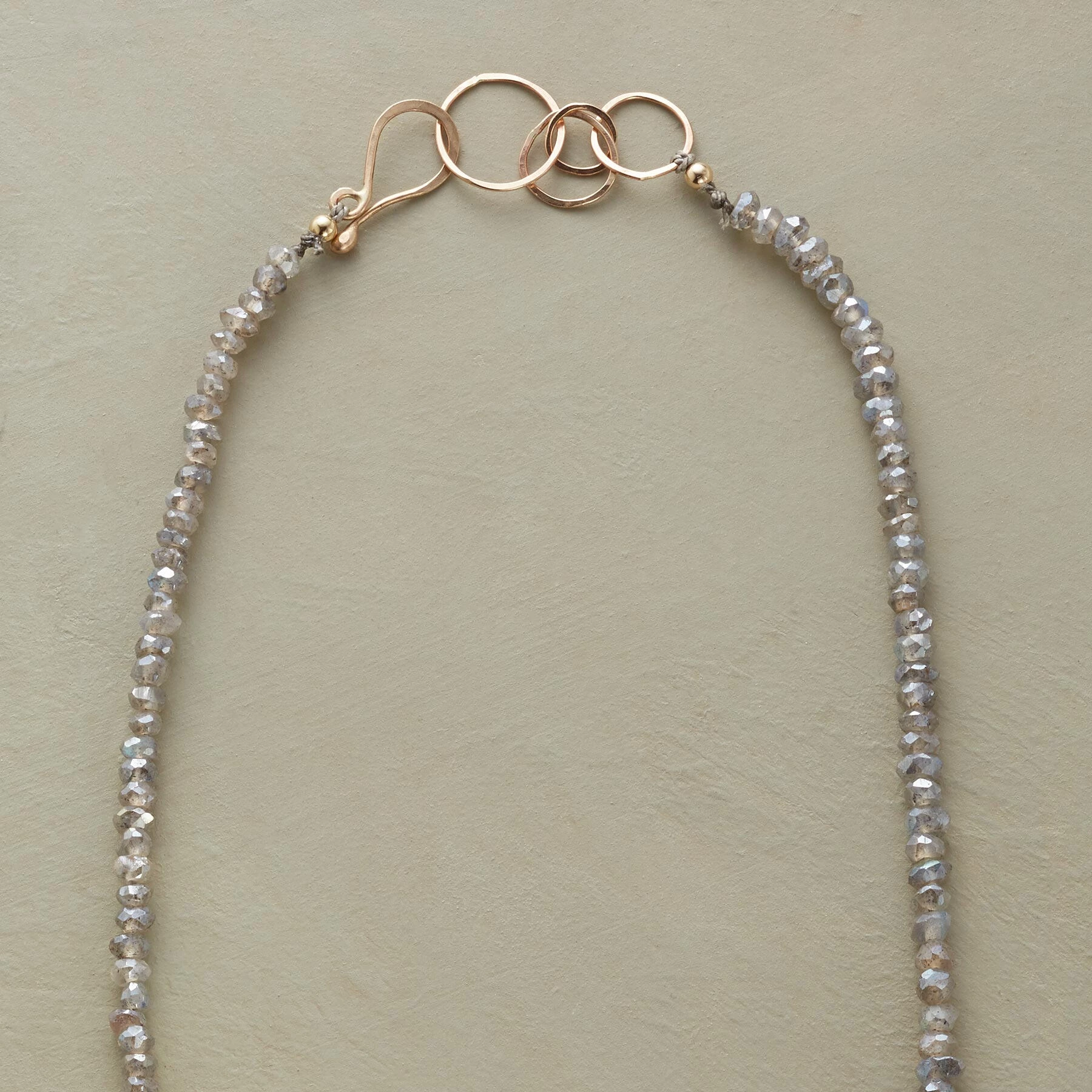 Countless little labradorites, each its own mix of smoky iridescence, leave behind a trail of sparkle. Handcrafted in USA by Kyoko Honda with 14kt gold hook clasp. 32″ to 32-1/2″L.