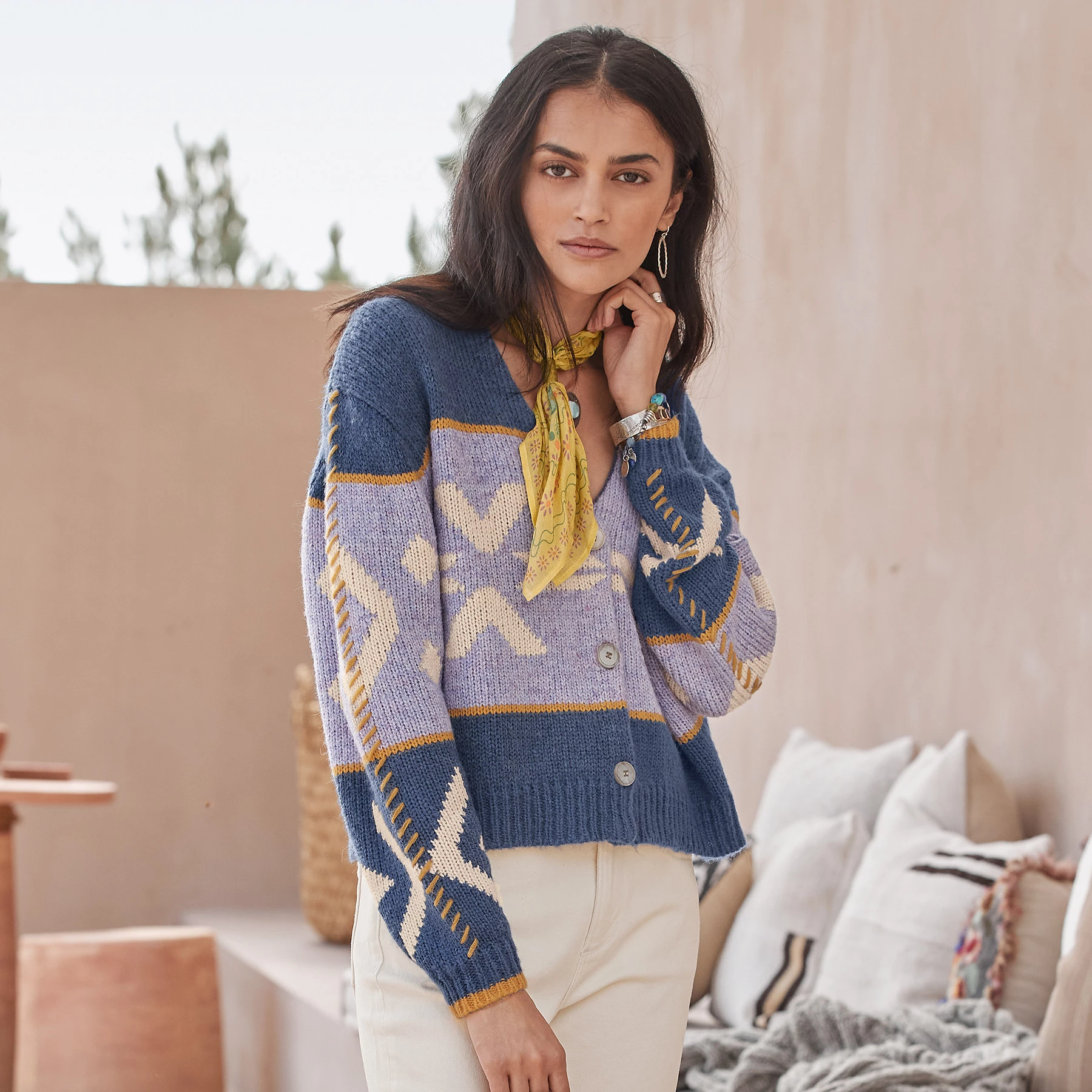 Cozy intarsia, button-front cardigan with allover pattern blocks, faced V-neck, hand-embroidered details. Acrylic/nylon/polyester/wool. Hand wash. Imported. Exclusive. Sizes XS (0–2), S (4–6), M (8–10), L (12–14), XL (16–18), XXL (20–22). Approx. 21″l. This item is running large, please size down a size.