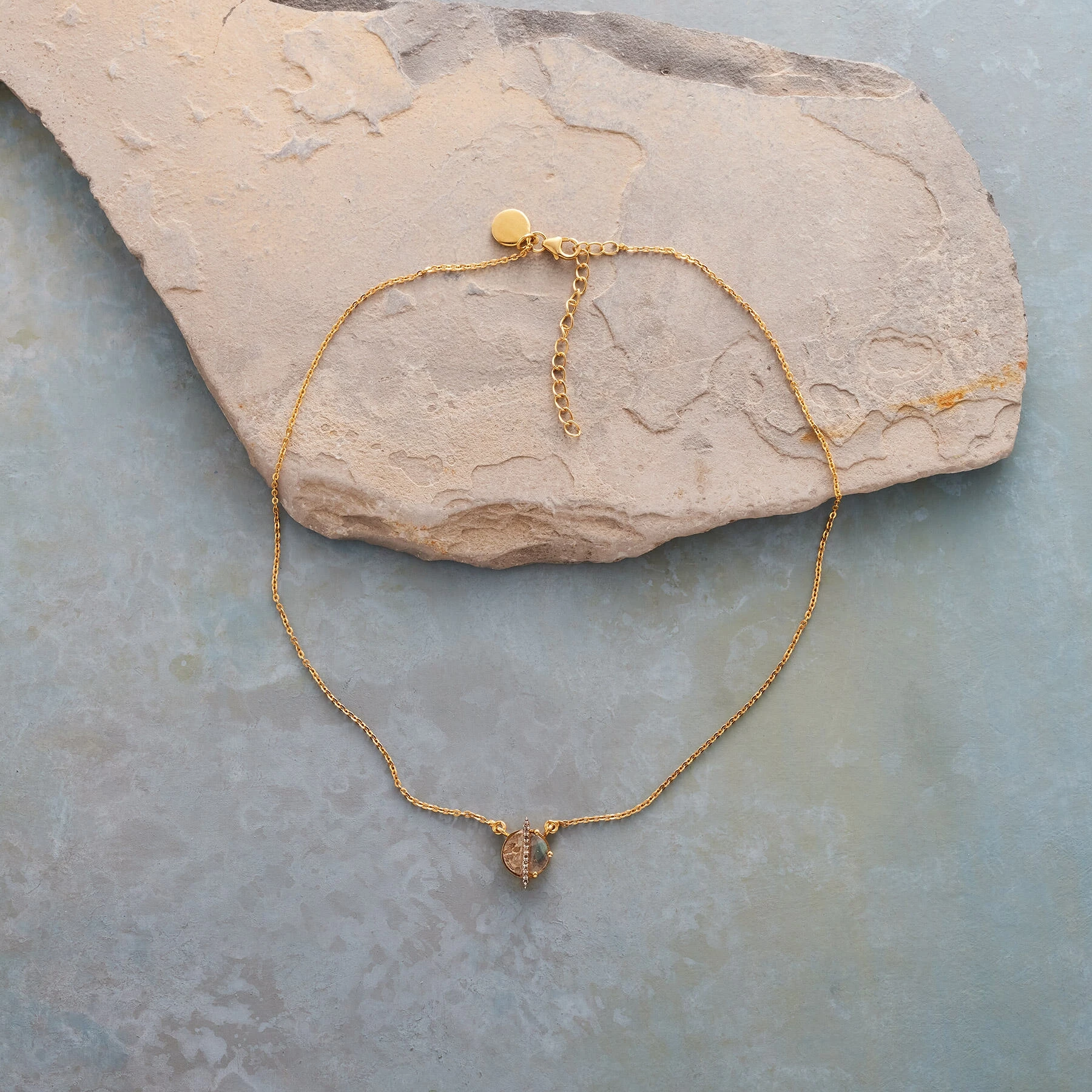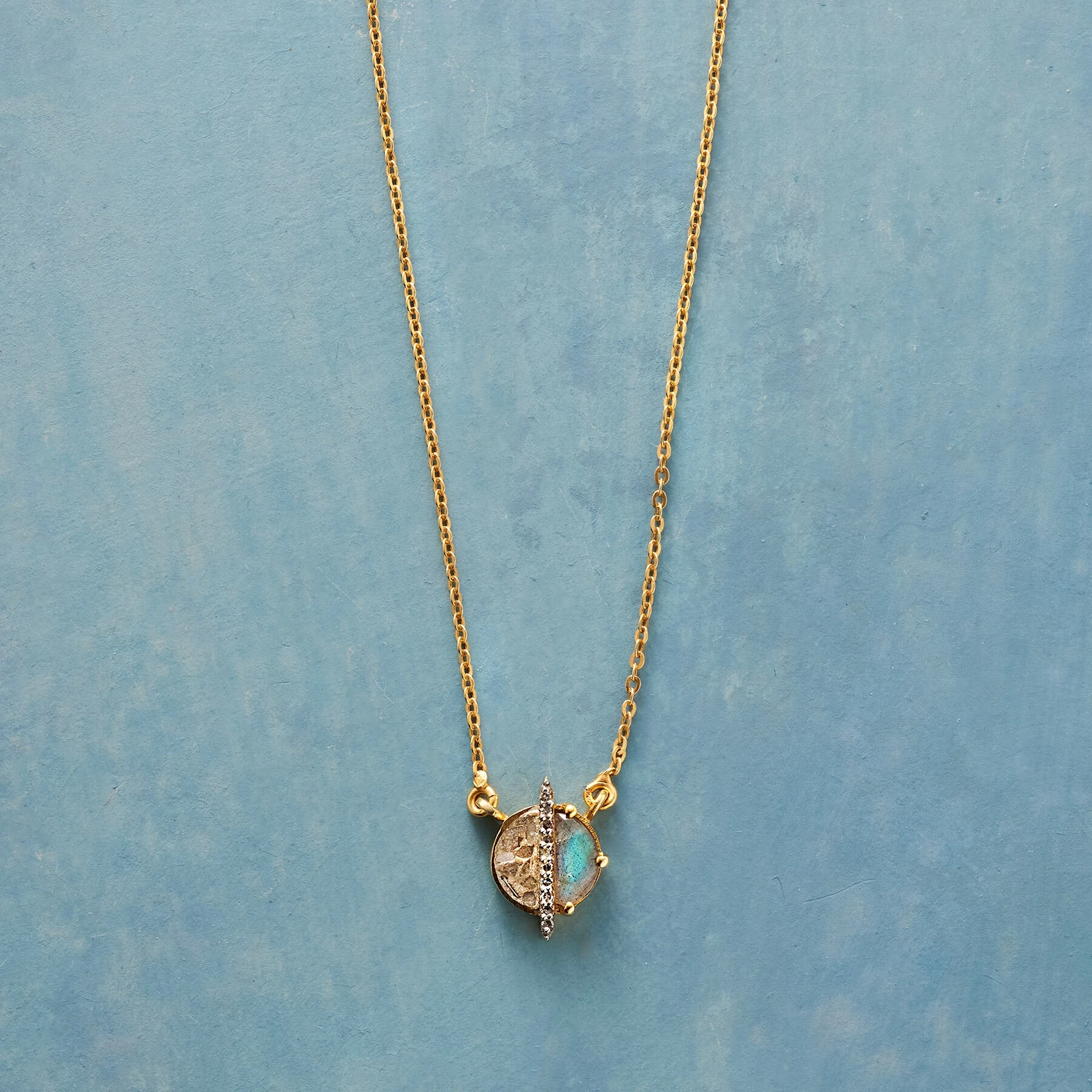 Between two equally promising visions of the future, a champagne diamond bar bisects labradorite and raw uncut diamond pavé. Handcrafted in 18kt gold vermeil. Lobster clasp. 15″ to 17″L.