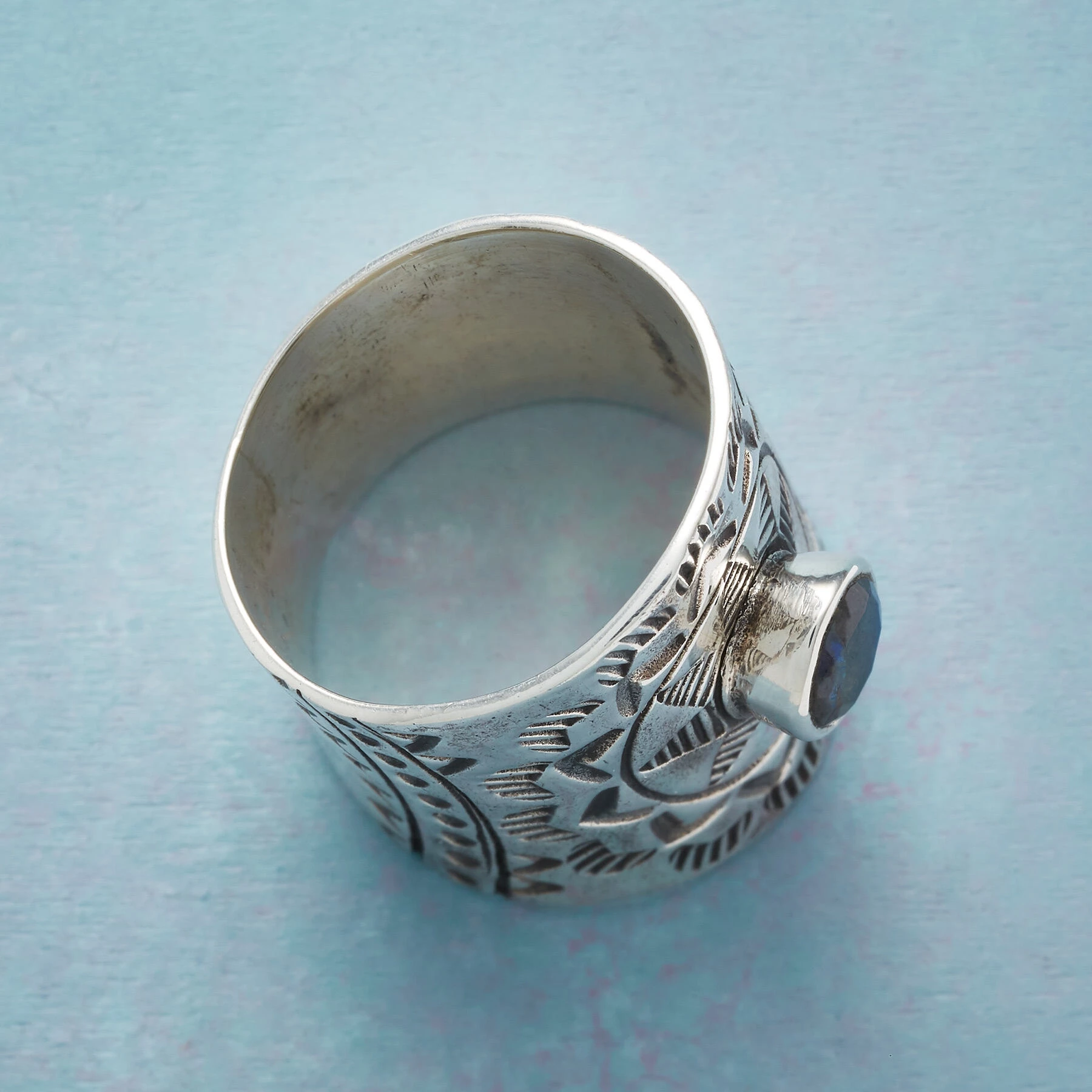 Starburst stampings oxidized for emphasis radiate from a center-set labradorite on a bold expanse of sterling silver. Handcrafted in whole sizes 5 to 10. 7/8″ tapers to 1/2″W.