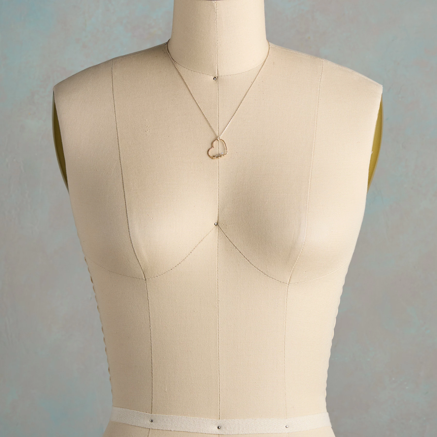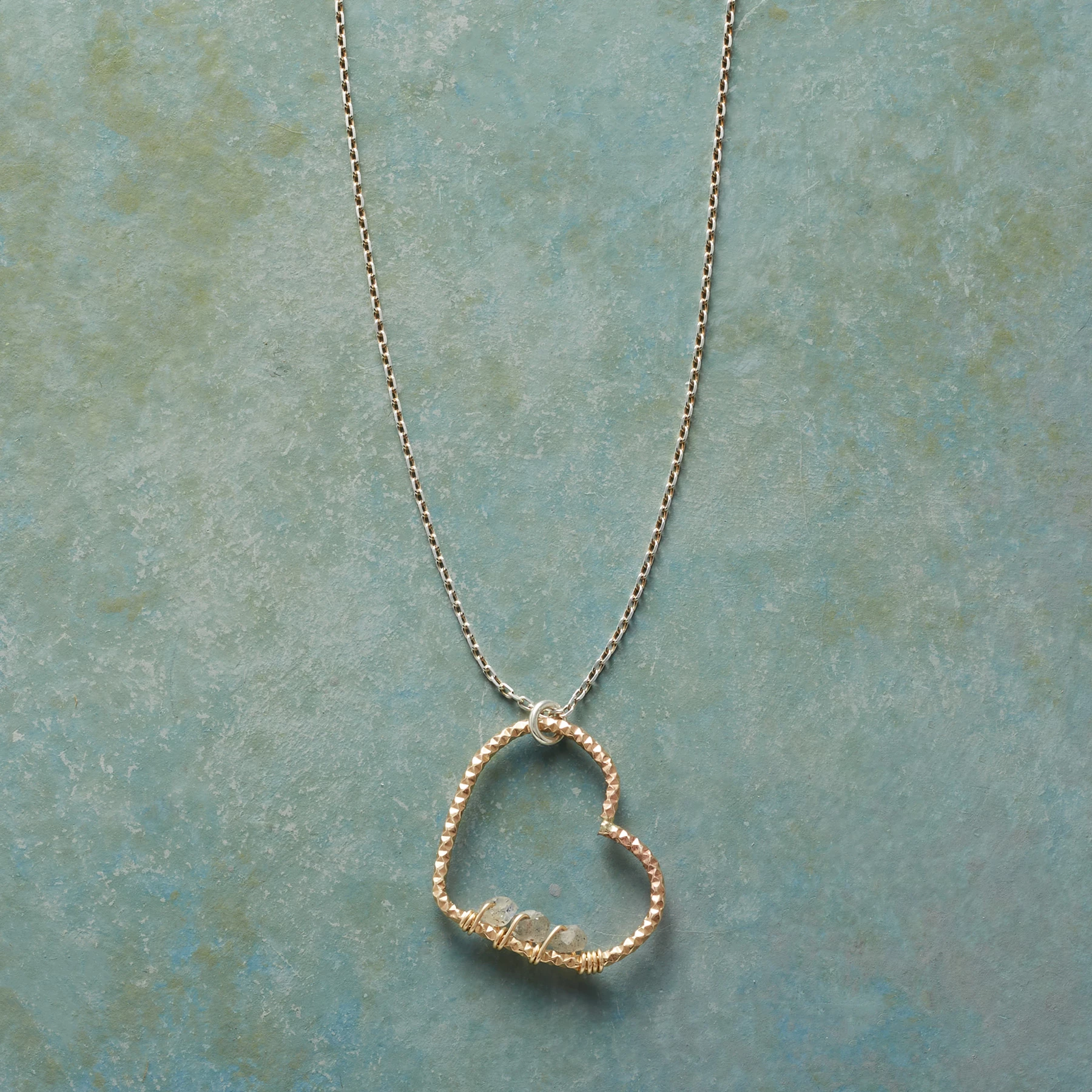Three shimmering labradorite nuggets, hand wrapped with 14kt gold fill wire, cling to a handcrafted 14kt gold fill heart that surrounds them with love. Sterling silver chain and lobster clasp. Made in USA. Exclusive. 17″L; 7/8″ drop.