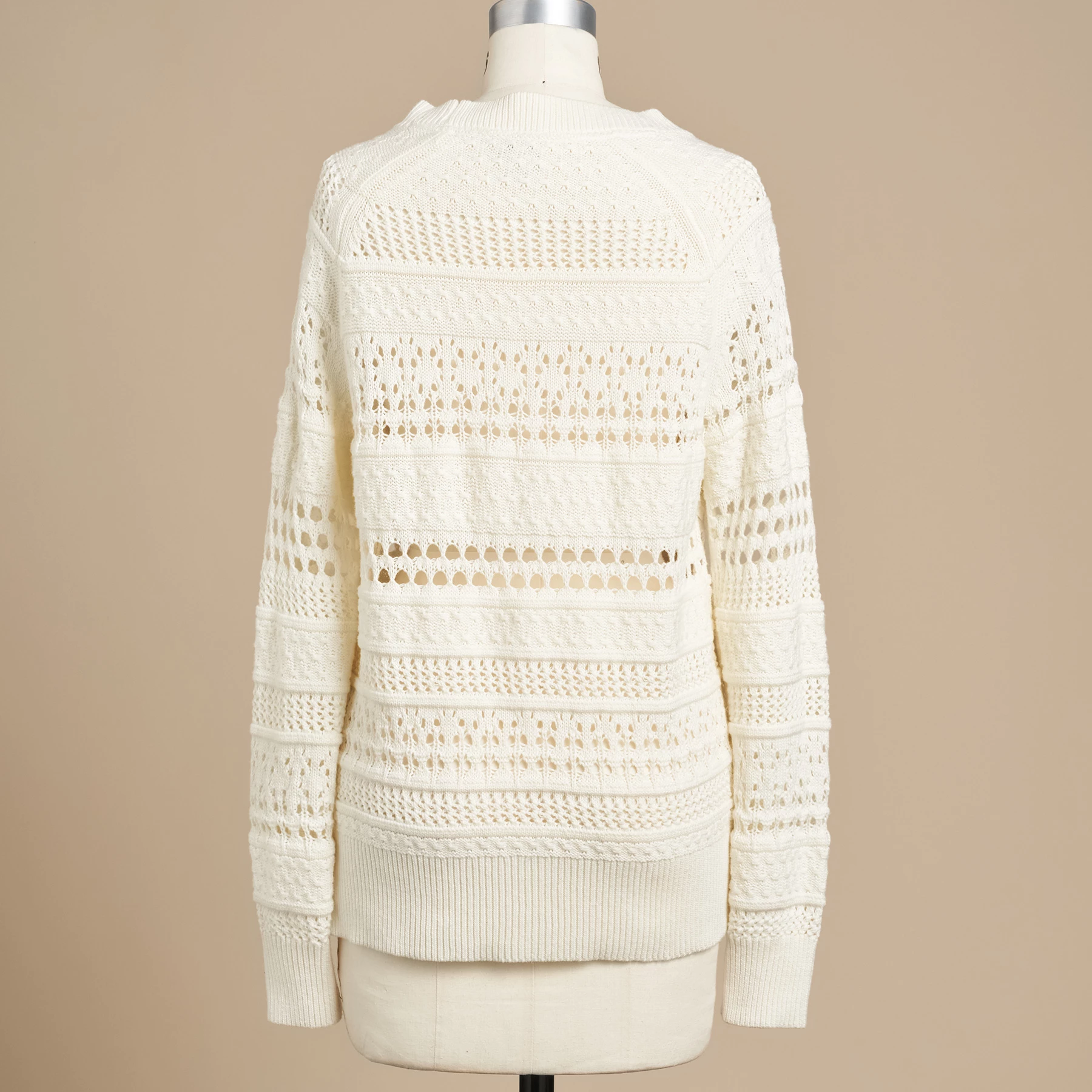 An airy and open, mixed-stitch cardigan with twill tape braided through the body of the sweater for marvelous texture. With rib trim and wooden buttons. Relaxed, easy fit. Cotton/acrylic. Hand wash. Imported. Exclusive. Sizes XS (0–2), S (4–6), M (8–10), L (12–14), XL (16–18), XXL (20–22). Approx. 24-1/2″l.