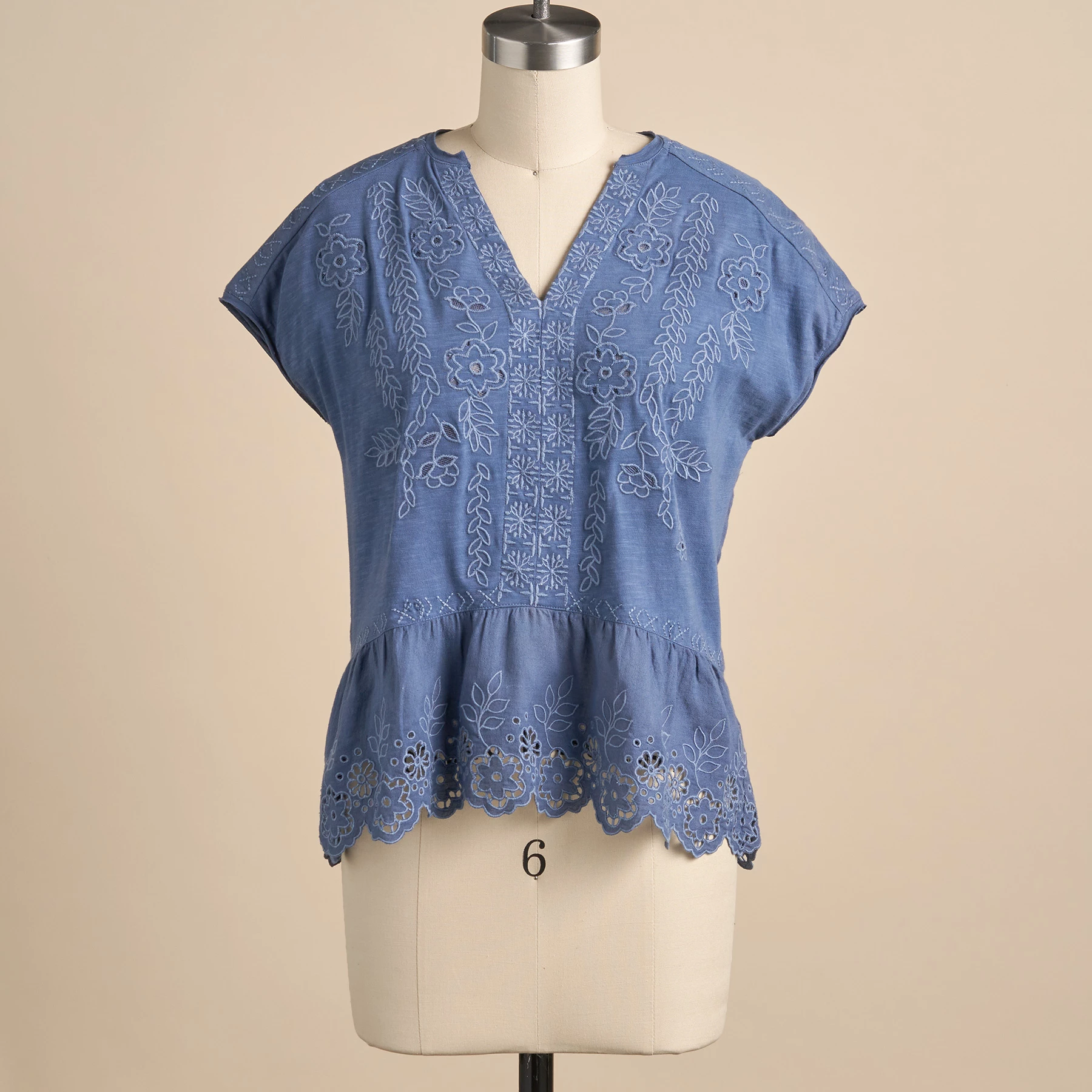 Our mixed fabric top is inspired by blooming florals with detailed embroidery, scalloped hem and feminine flounce at the back yoke. Lace trim and twill tape detail. Cotton. Machine wash. Imported. Exclusive. Sizes XS (0–2), S (4–6), M (8–10), L (12–14), XL (16–18), XXL (20–22). Approx. 23-1/2″l.