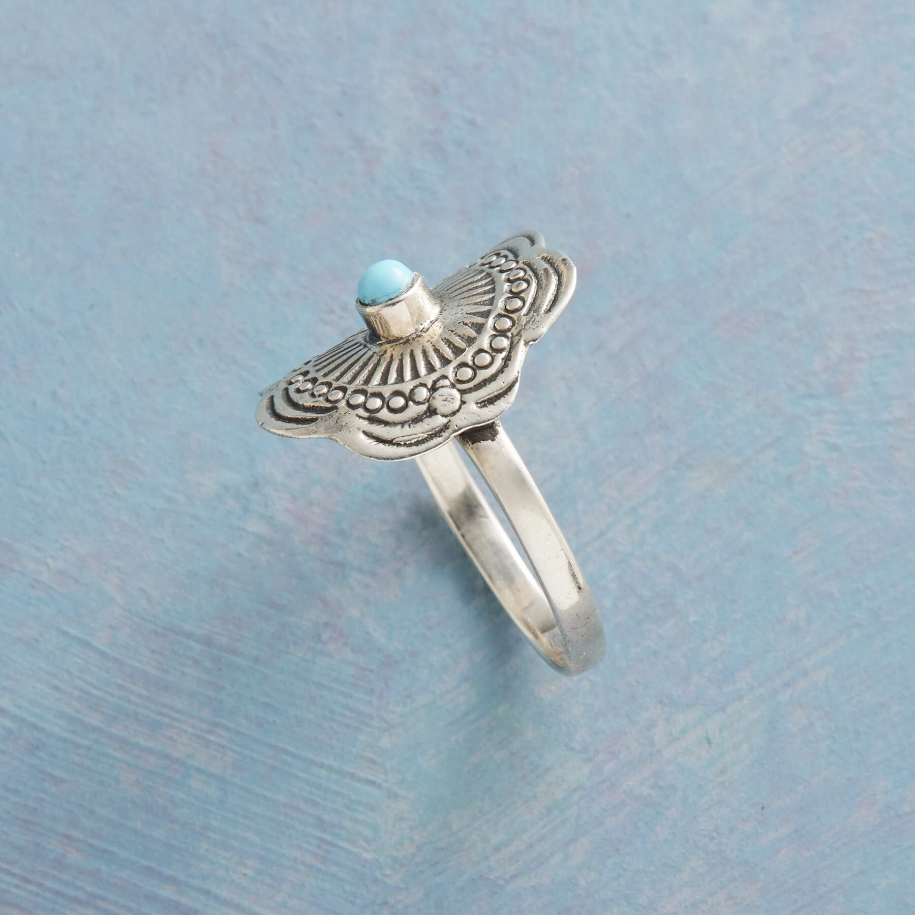 A concho with scalloped edges bears a bezel-set turquoise amid oxidized stampings. Handmade in sterling silver. Whole sizes 5 to 9.