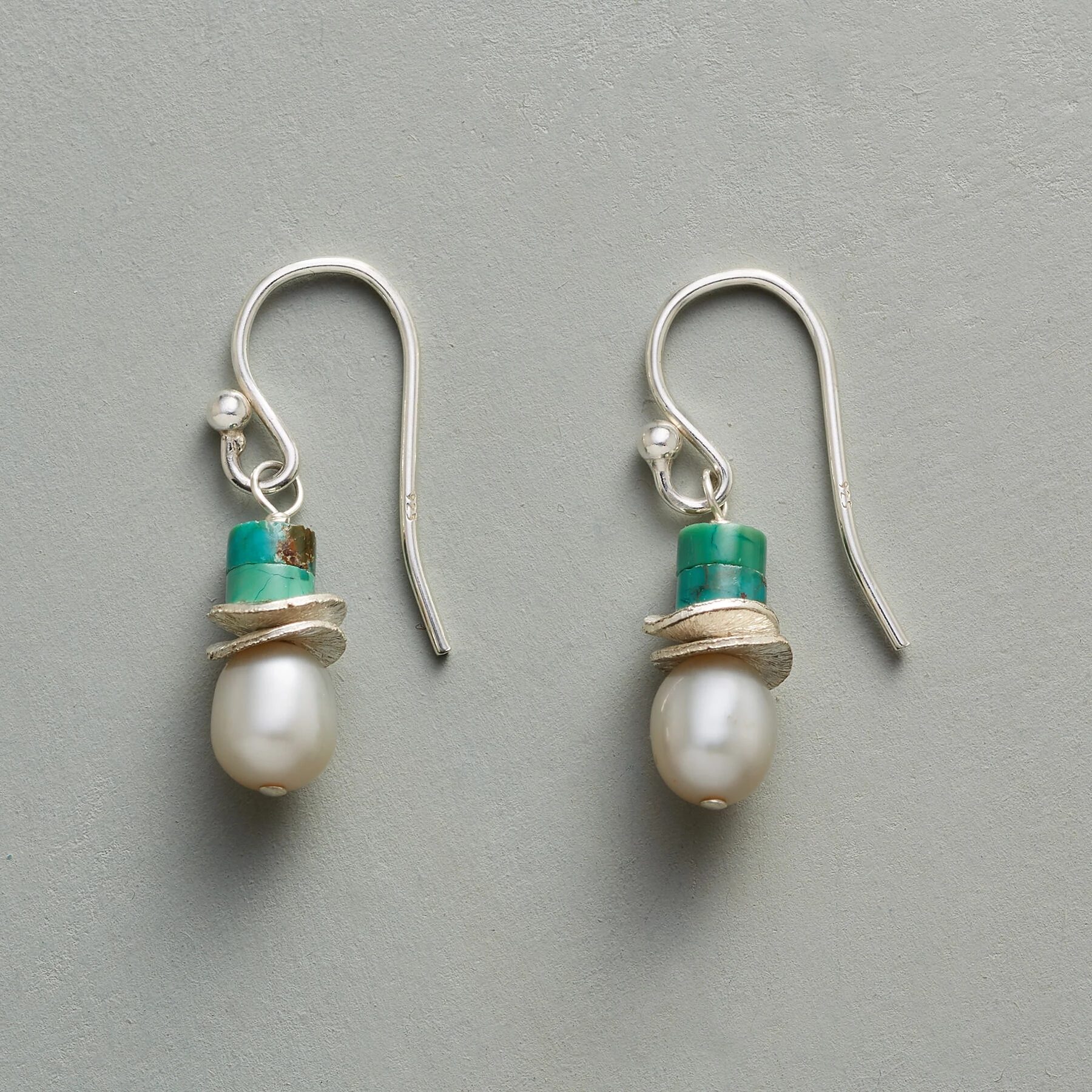 The freshwater pearls of our dangle earrings fall beneath a top hat of heishi turquoise beads and brushed sterling disks. Sterling silver wires. Made in USA. Exclusive. 7/8″L.
