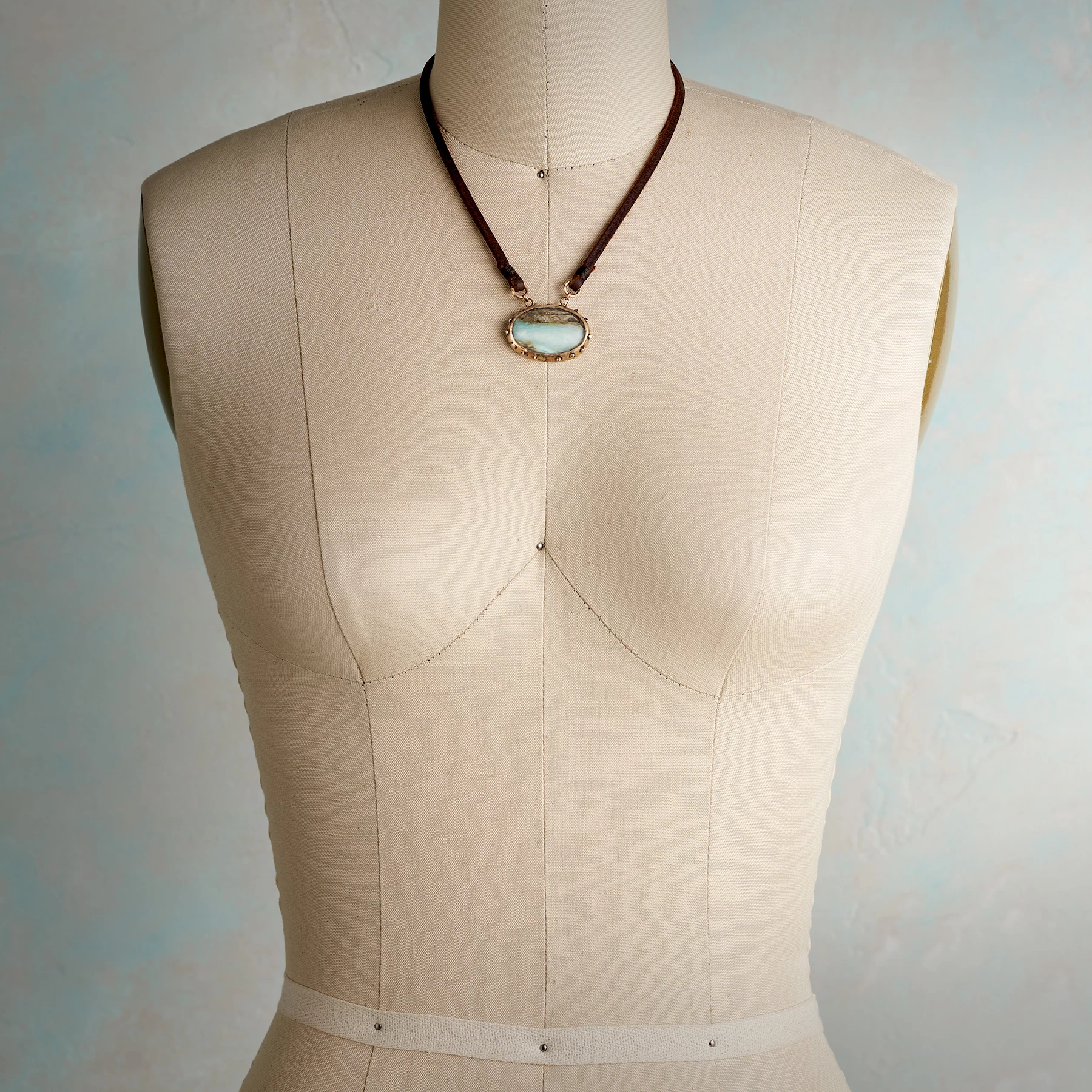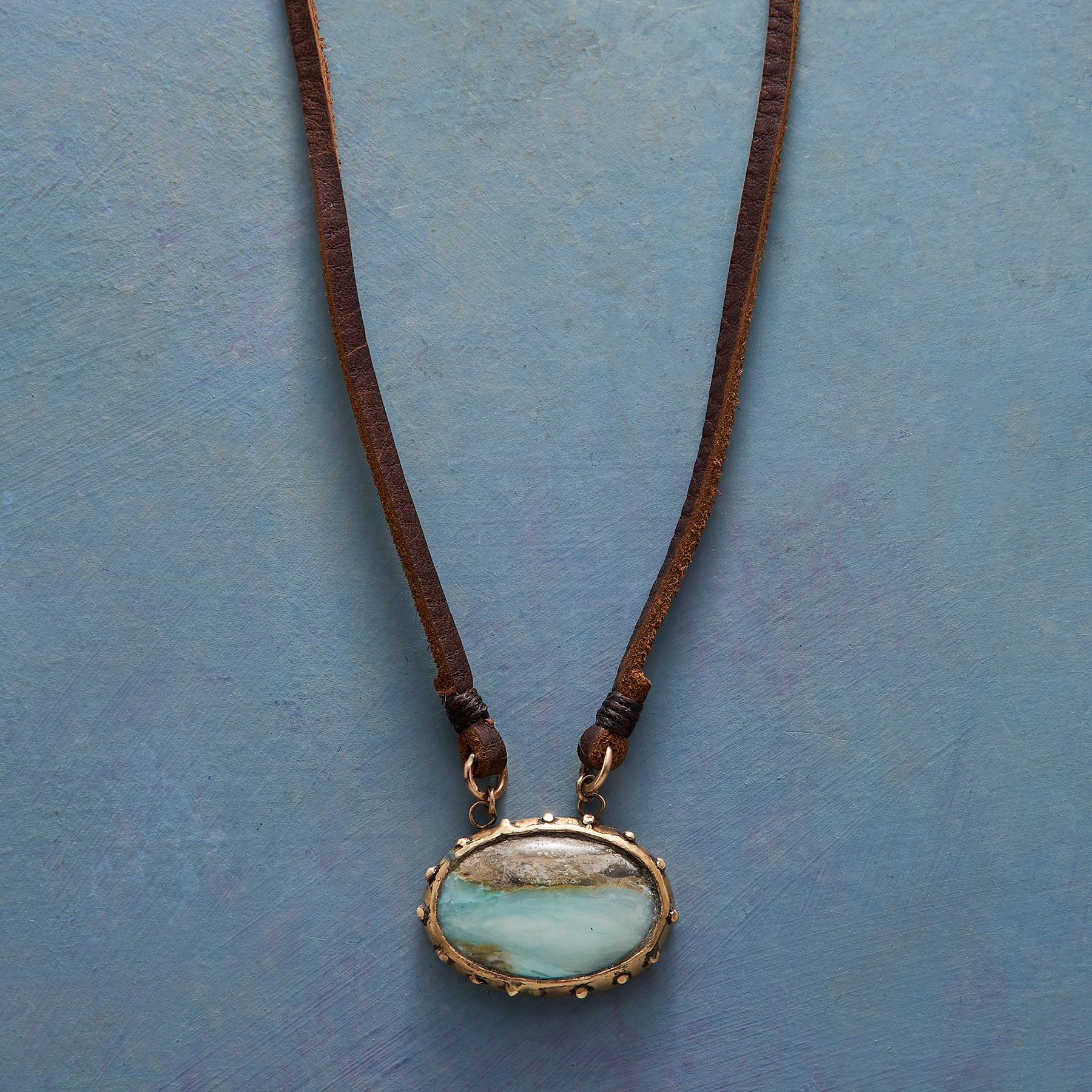 Peruvian opal’s varied hues remind Jes MaHarry of walks in the wilderness….each gem’s unique pattern a different journey. 14kt gold bezel; leather laces with sterling silver slider. Handmade in USA. Exclusive. Adjustable to 36″L, 1″ drop.