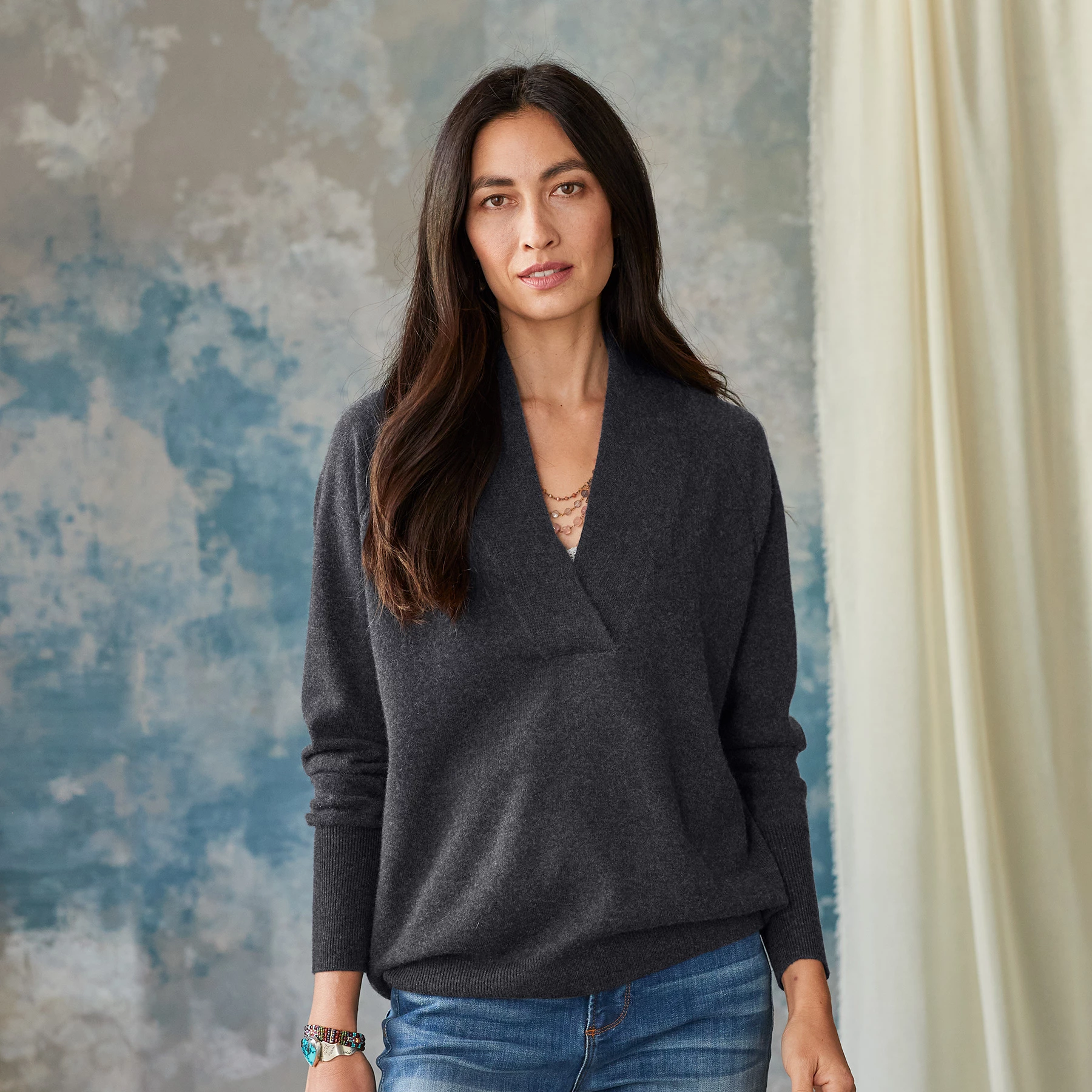 Our cozy, relaxed sweater is simple elegance with shawl collar and rib trim. Cashmere. Hand wash. Imported. Exclusive. Sizes XXS (00), XS (0-2), S (4-6), M (8-10), L (12-14), XL (16-18). Approx. 23″l.