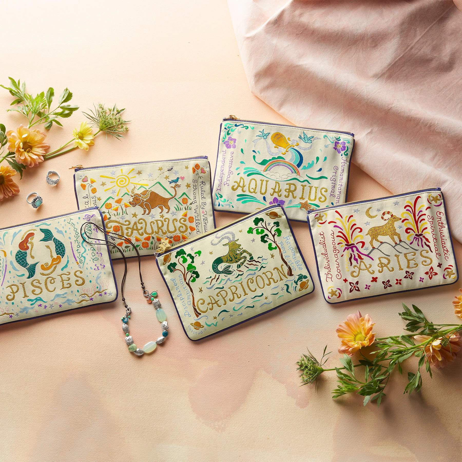 Sized to hold jewelry, make-up or cash and cards, these zippered pouches celebrate the zodiac with bright, fun graphics and each sign’s best attributes on one side and the constellation on the other. Metallic threads lend celestial glitter and a star-shaped fob wink on the zipper. Imported. 8″W x 5-1/2″H x 1/4″D.